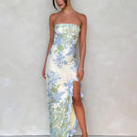 The Phoenix Maxi Dress is the definition of effortless heat, reimagined in a bold all-in-one silhouette with a vintage-inspired Paisley Tapestry print. Designed in-house with intention, this piece is crafted from breathable mesh and fully lined for coverage, offering both statement style and all-day comfort. The bandeau neckline features gel tape for a secure hold, while a thigh-high split and frill-trimmed asymmetric hem deliver bold, feminine movement with every step. Whether you're headed to a beach club, rooftop dinner, or music festival, this dress makes the entrance for you.