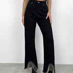 Elevate your denim with the Soirée Beaded Hem Jeans, designed to bring a little sparkle to your everyday. These high-rise jeans feature a flattering straight-leg fit and a show-stopping beaded fringe hem that dances with every step.